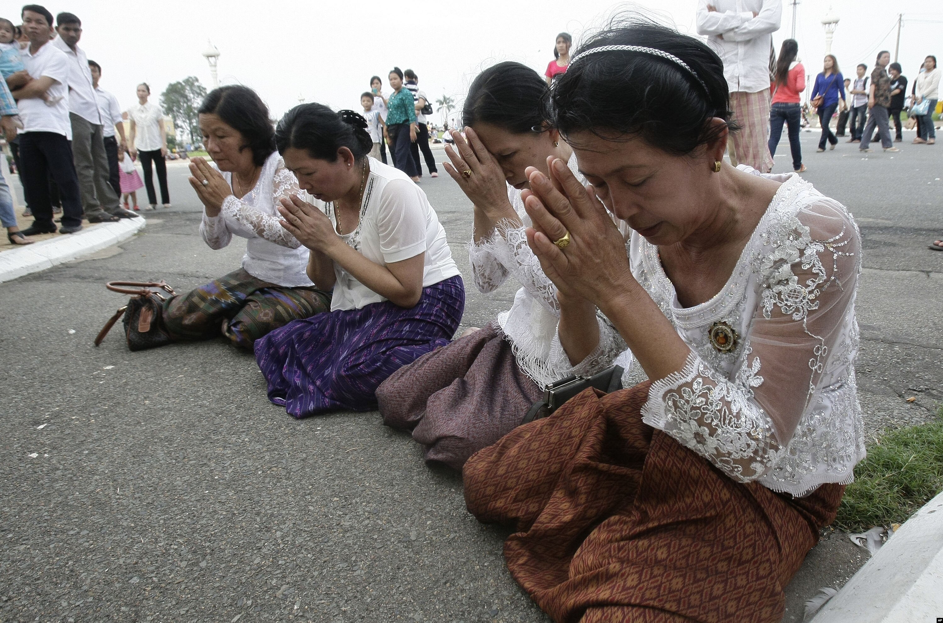 Dân chúng Campuchia cầu nguyện trước hoàng cung ở Phnom Penh khi được tin cựu quốc vương qua đời. 15/10/2012