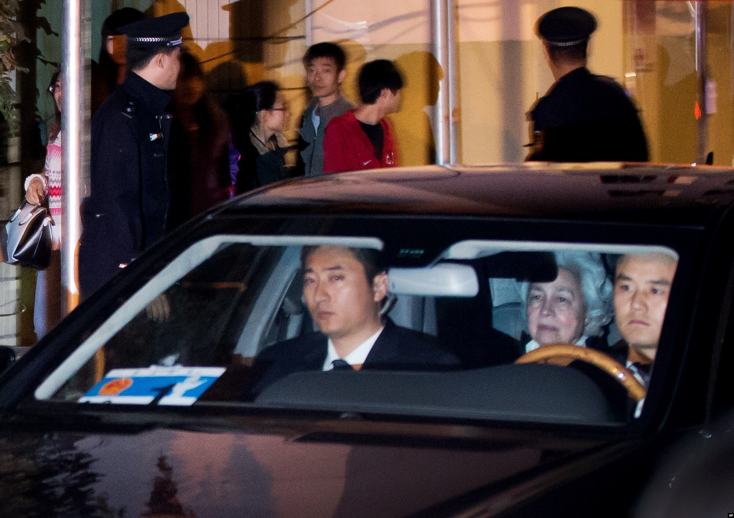 Hoàng hậu Monineath Sihanouk, phía sau, đến bệnh viện ở Bắc Kinh, nơi cựu quốc vương được chữa trị. 15/10/2012