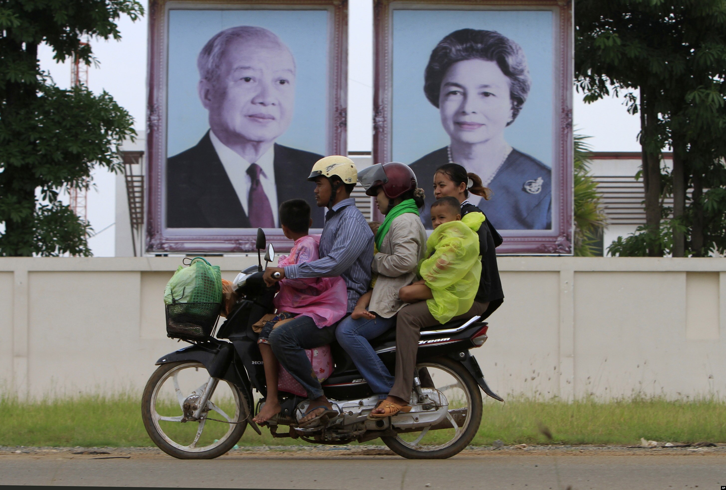 Ảnh chân dung của cựu quốc vương Norodom Sihanouk và hoàng hậu Monineath được trưng bày ở vùng ngoại thành Phnom Penh. 15/10/2012