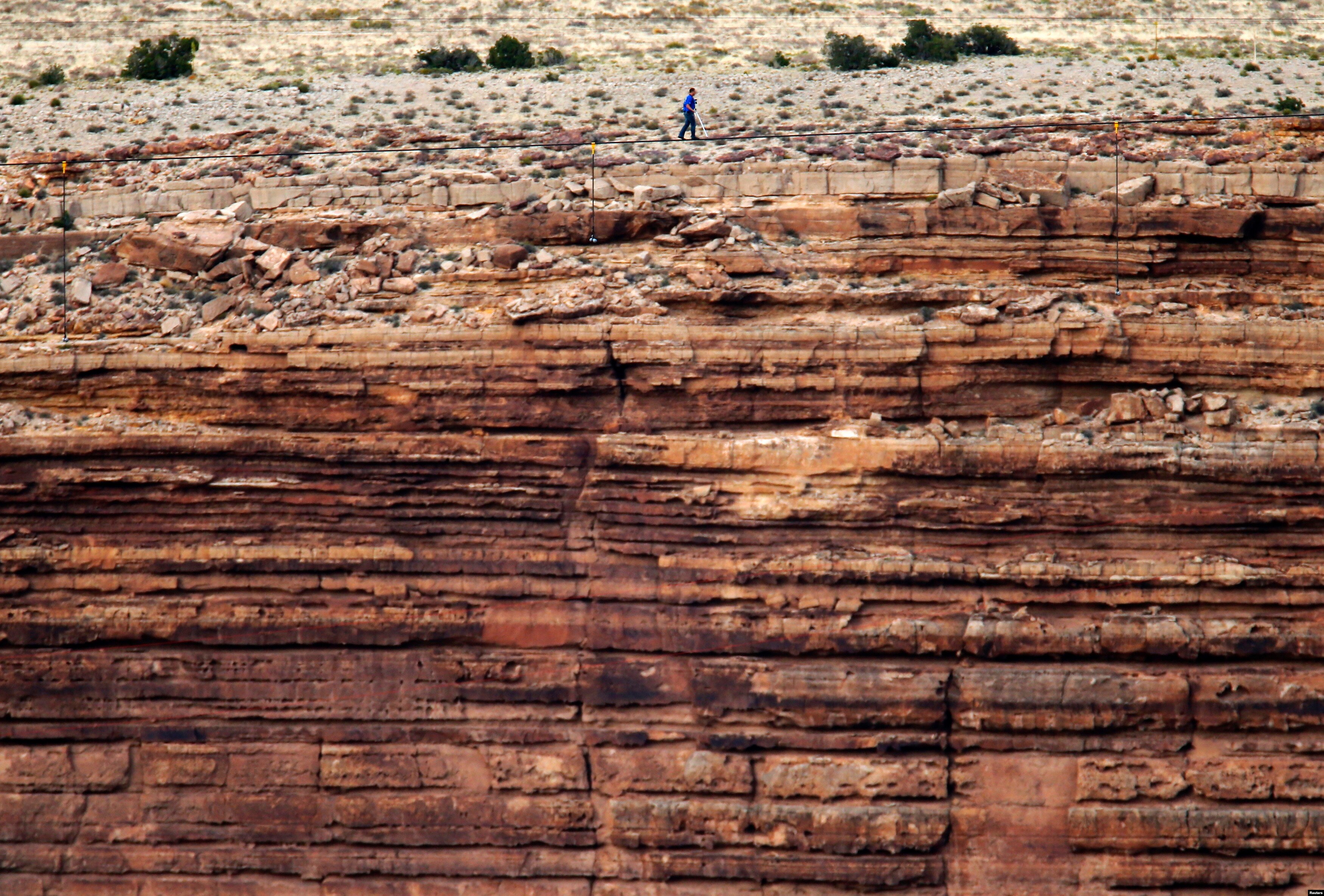 Tay mạo hiểm Nik Wallenda gần hoàn tất nỗ lực đi trên dây căng qua hẻm núi sông Little Colorado ở đông bắc bang Arizona, ngày 23 tháng 6, 2013. Anh phải vượt qua hẻm núi trên sợi dây cáp bằng thép chỉ rộng 5cm.