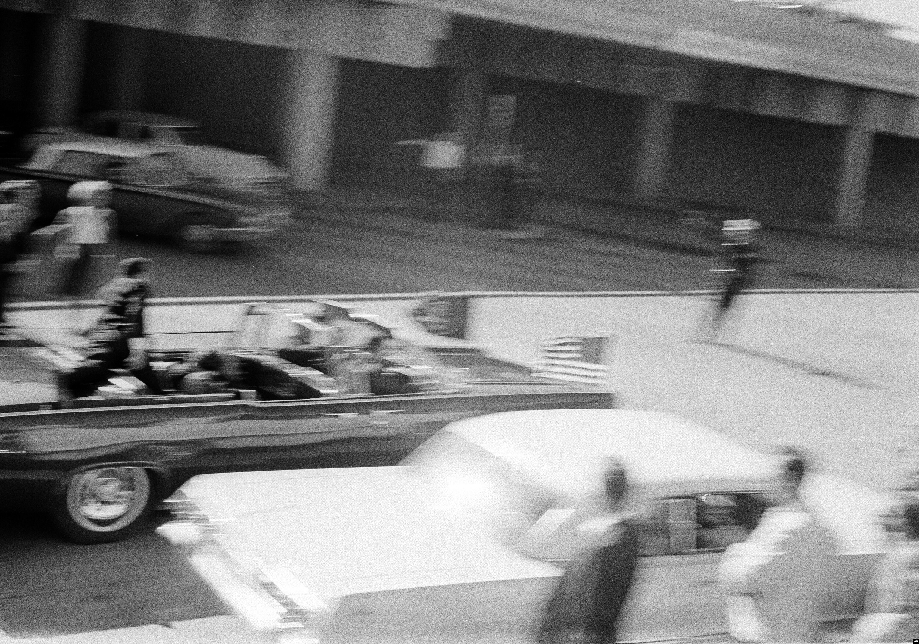 Chiếc xe chở Tổng thống chạy nhanh trên đường Elm về hướng chiếc cầu trên xa lộ Stemmons sau khi ông bị bắn tại Dealey Plaza ở Dallas, Texas, 22/11/1063.