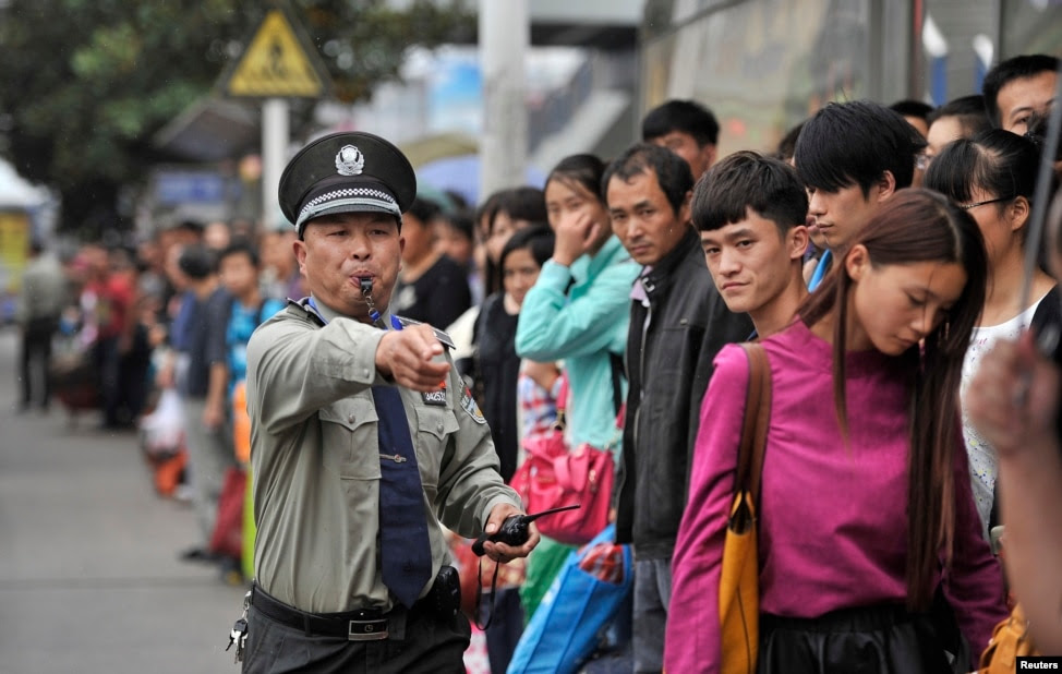 Bảo vệ giữ trật tự tại một trạm xe buýt bên ngoài nhà ga xe lửa của thành phố vào lúc cao điểm trong ngày cuối cùng của dịp lễ Quốc khánh của Trung Quốc ở Hợp Phì, tỉnh An Huy.