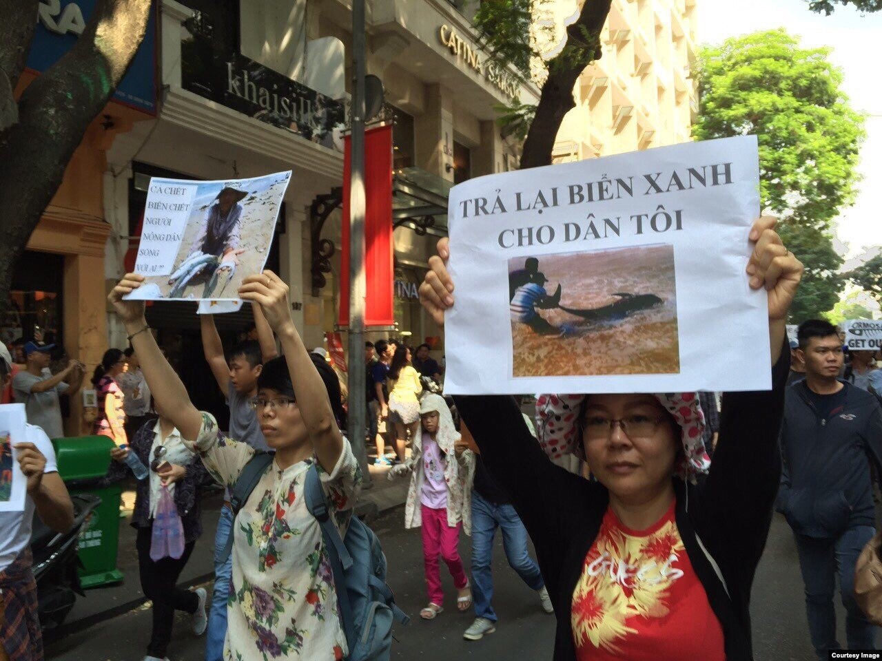 Người biểu tình xuống đường tại Hà Nội mang theo những biểu ngữ như “Tôi yêu môi trường biển”, Toàn dân Việt Nam cứu biển”...phản đối vụ cá chết hàng loạt ở miền Trung, ngày 1//5/2016.