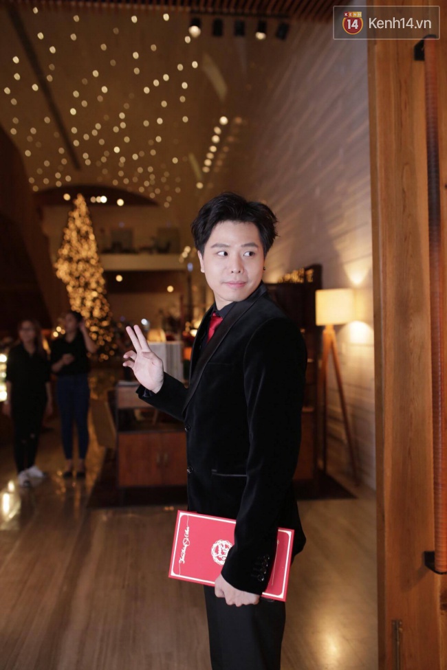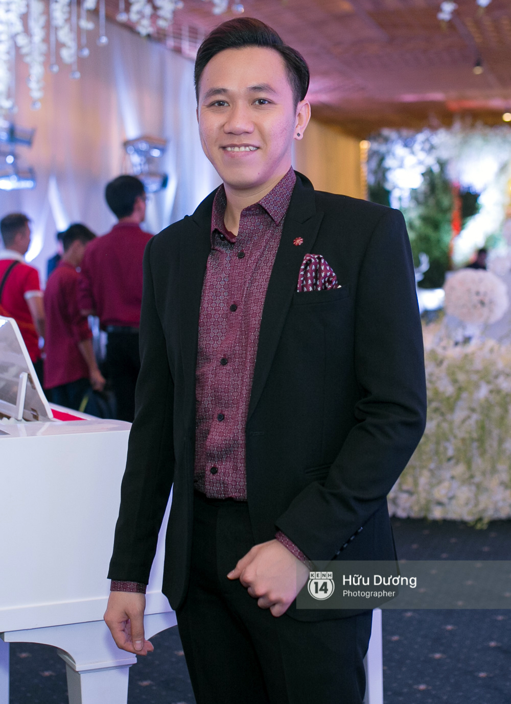 Khoảng 18h, những vị khách đầu tiên bắt đầu xuất hiện trong tiệc đám cưới của Trấn Thành và Hari Won. Người bạn thân Anh Đức chọn cho mình bộ vest đen lịch lãm.