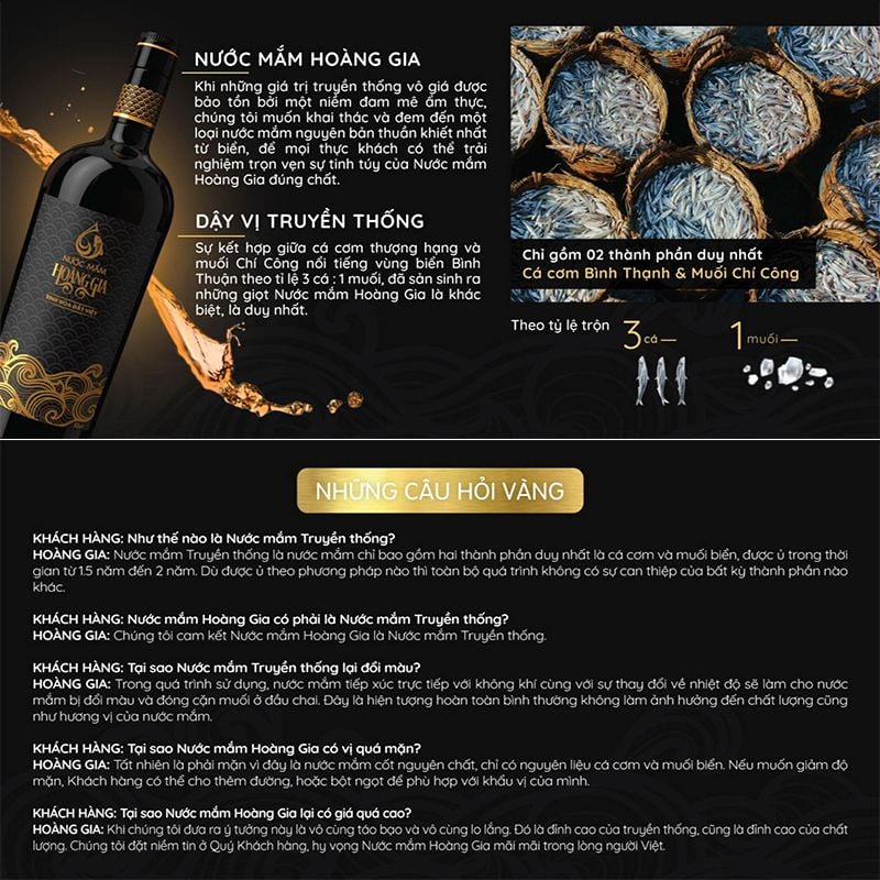 Nước mắm ngon, đậm đà hương vị của cá cơm và muối biển, không chỉ đơn thuần là gia vị của ẩm thực mà còn là gia vị của sự quan tâm, của yêu thương và chân tình trọn vẹn. Nước mắm Hoàng Gia chính là món quà quý giá và tinh tế nhất dành tặng cho những người thân yêu vào các dịp Lễ Tết và những ngày trong năm.