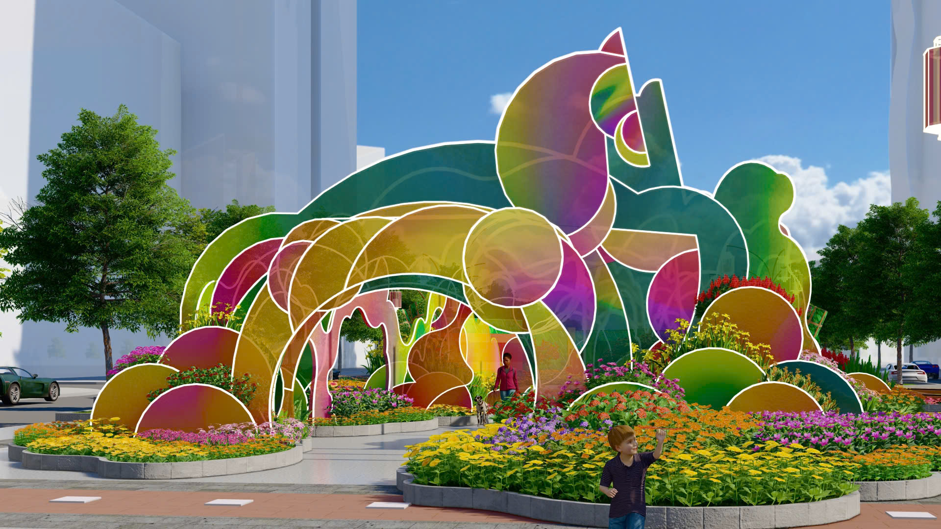 Cụm đại cảnh "Lý ngựa ô" gợi nhắc nét văn hóa Nam Bộ qua tạo hình vui nhộn, gam màu xanh ngả tím hiện đại